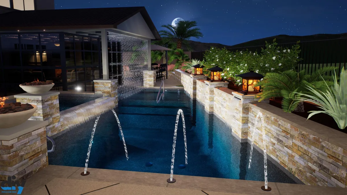 Paired beautifully with turf separated pavers around the pool, neutral colors, glass tiles, and creative design esthetics.